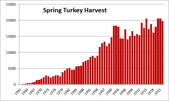 野生動物資源部 (DWR) 宣佈在2022春季火雞季節將收穫19 、 711火雞。這是記錄的第四個春季火雞收穫,其中三個最高收穫是在 2015、2021 和 2020。DWR 執行董事 Ryan Brown 表示:“弗吉尼亞州的春季火雞季節繼續為人們提供與大自然、家人和朋友聯繫的激動人心的機會,同時幫助保護該州的野生動物資源。”