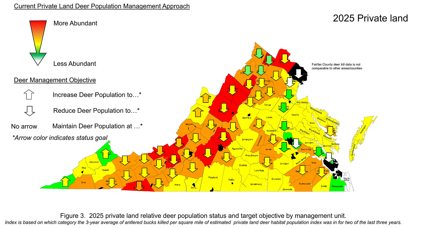比較維吉尼亞州鹿群數量的最佳方法是根據估計的鹿棲息地每平方英里的雄鹿數量來計算。這是我們用來監控鹿人口趨勢的人口指數。圖 3 顯示了在過去三個狩獵季節平均每平方英里的私人土地棲息地上角鹿角的殺死次數的相對差異。請注意,Virginia有97主要的鹿管理單位。