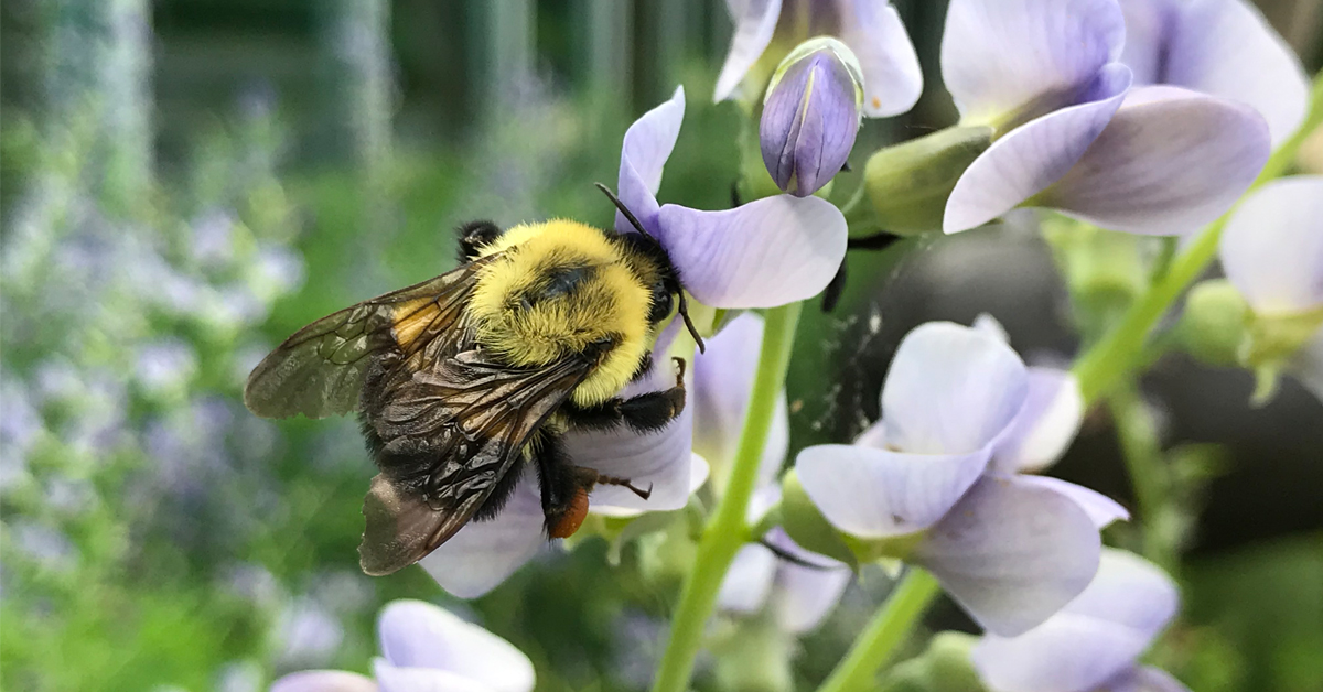 常見的東方大黃蜂在原生藍色野生藍色(Baptisia australis)上。當花粉粘在身體上時,蜜蜂使用腿內側的梳狀毛髮,將花粉食物刷成位於腿外側的籃子形狀結構,稱為球菌。一個滿的籃子,這裡被視為一個深橙色的堆積,可以容納多達 1 百萬顆花粉粒,然後將其帶回巢穴。