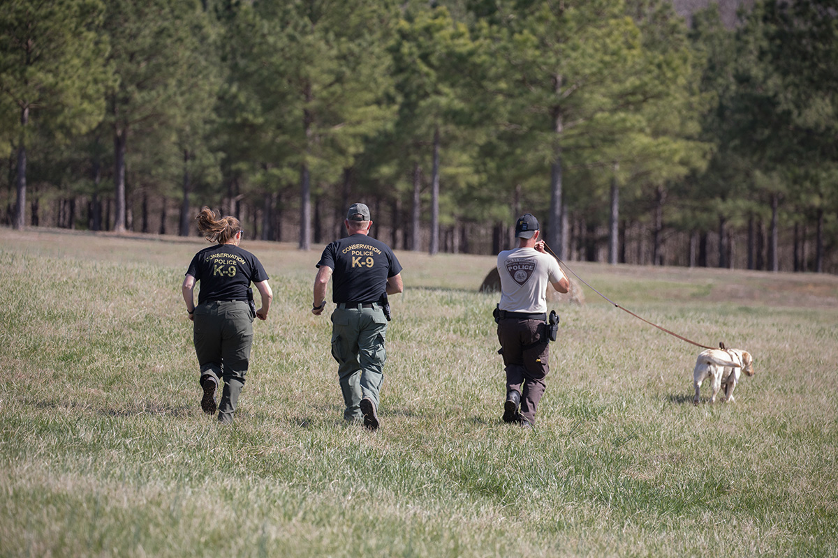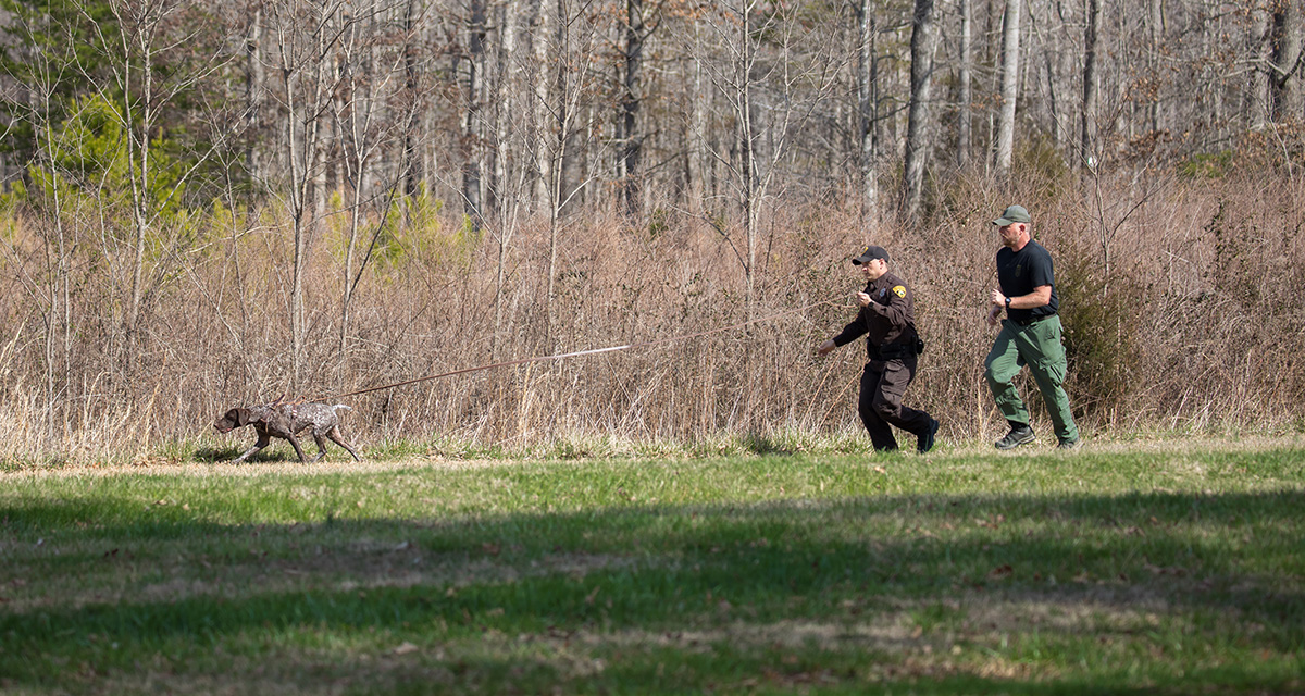 DWR 的 CPO Bonnie Braziel(中)和警長 Richard Howald(右)正在協助西維吉尼亞州 DNR 的 K 9警官和警犬提高技能並獲得認證。