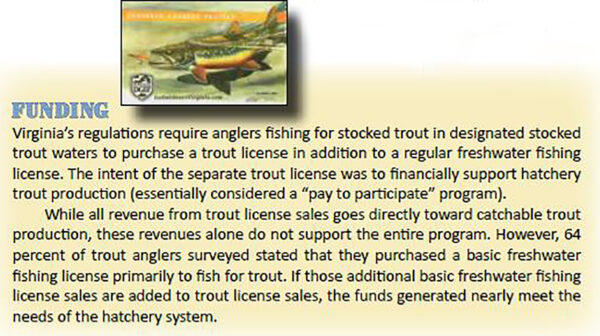 可捕鱒魚放養計畫是 DWR 計畫中最受歡迎的組成部分,約佔維吉尼亞州鱒魚釣魚活動的80 %。大致 1。在 135 溪流和 32 個池塘和湖泊(總計為 204 不同的溪流段和埋地),將有 2 百萬隻可捕獲大小的鮭魚(600、000 磅)。所有可捕捉大小的飼養的鮭魚在庫存時長至少為 7 英寸。然而,DWR 嘗試生產平均長度為10 ½” ( 0 . 45磅) 用於養殖這些水域。