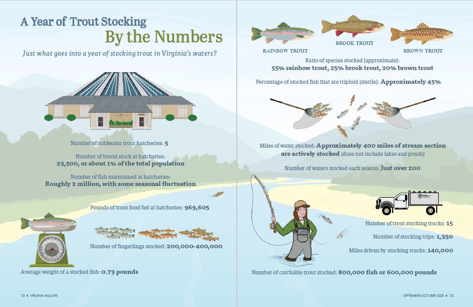 野生河豚目前佔據了超過 614 個個別溪流(2,000 + 英里),橫跨弗吉尼亞西部和西南部的藍嶺和阿利甘尼高原地區。目前有 163 溪流(約 700 英里)存放野生彩虹鮭群,以及 92 溪(約 600 英里)含有野生棕色鮭魚。