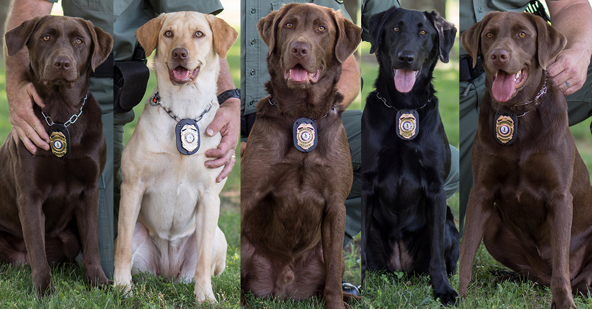 五名訓犬師和警犬在春季接受了弗吉尼亞州野生動物資源部 (DWR) K 9自然保護警察的訓練,現已完成訓練課程,目前正在 DWR 自然保護警察部隊擔任警官。幾隻狗已經為解決案件做出貢獻!