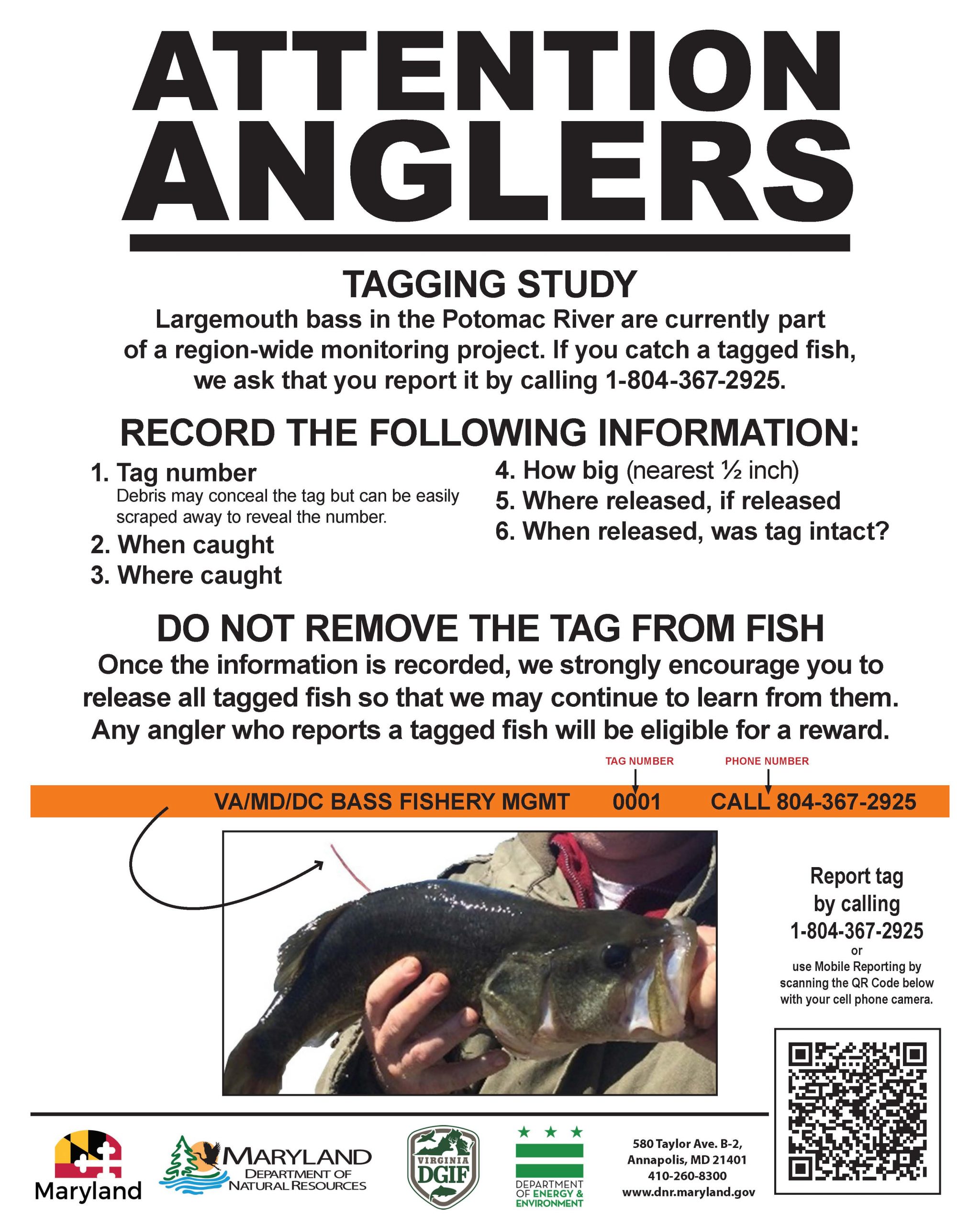 波托馬克河的潮汐受影響的淡水棲息地中,將在電捕魚調查中捕獲,然後測量、衡量、標記和釋放。捕獲標記魚的釣魚者可以報告標籤號碼,捕獲日期,魚的大小以及捕獲和釋放地點。報告捕獲標記魚的釣魚者將參加年度彩票以獲得獎品。他們可以致電 804-367-2925 或發送電子郵件 basstag@dwr.virginia.gov 以留下信息。