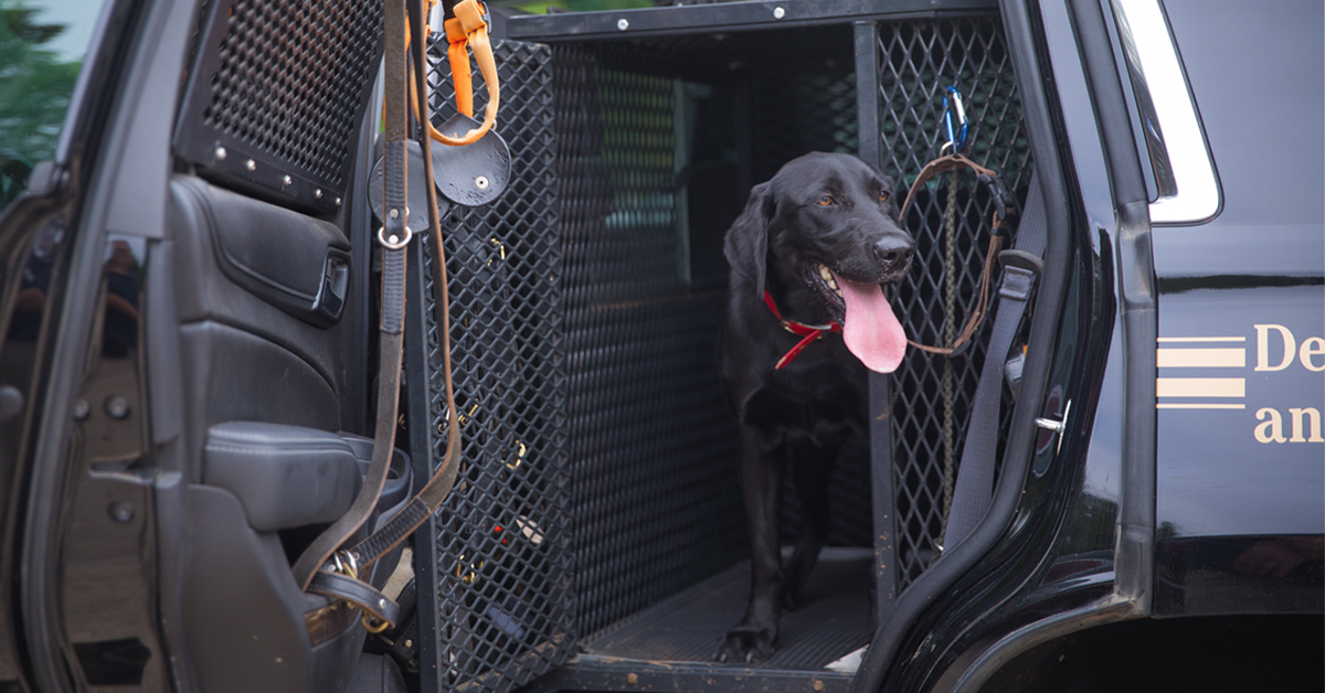 每輛 K 9 車輛(通常是 SUV 或四門卡車)都有一個特殊的金屬狗籠,並安裝了橡膠地板在後座位。K 9 的車輛在車輛運動時會騎在狗籠內,除非他們的管理員帶他們出去,否則會留在犬舍內。「他們有一個窗戶,狗可以把頭向車輛前方向上伸出,還有一個內門。有了犬舍內部門,我們可以打開車後門,讓他們獲得新鮮空氣,而不必擔心他們會跳出車輛,」負責 K 9 Bailey 的 CPO James Patrillo 表示。