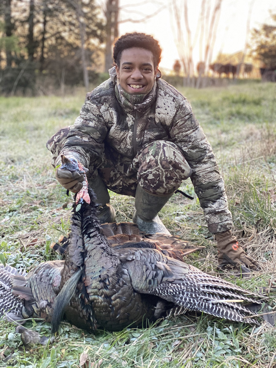 幾分鐘後,不是一隻,而是兩個成熟的食者出現在樹林邊緣,就在一個電動牛圍欄後面。當鳥類移動到 35 碼以內的時候,納泉準備好射擊其中一隻鳥。日出後,Na'Quan 收穫了他的第一個火雞,重量為 23。26 磅(加 10)。5 英寸鬍鬚和大約 1 英寸刺。當我們站在雄偉的鳥旁邊時,我問 Na'全:「你感覺如何?」他大眼睛,微笑大,回答:「我有一隻火雞!」