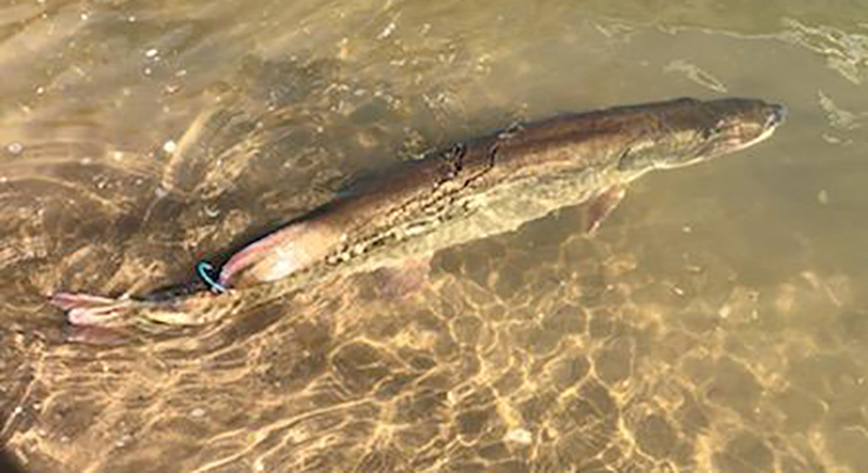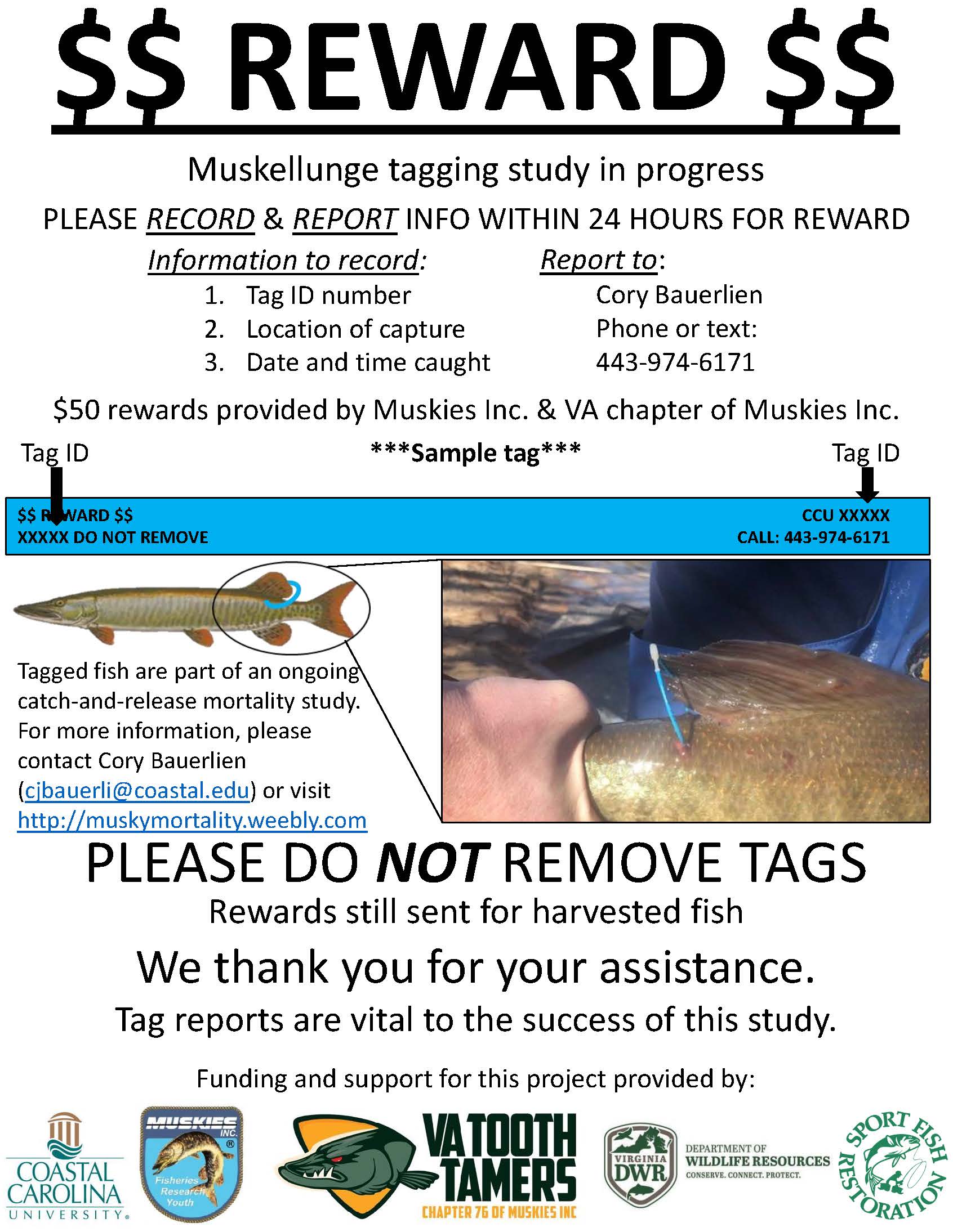 捕獲標記魚的釣魚者可以在 24 小時內通過電話或在 443-974-6171 發短信向卡羅萊納海岸大學的 Cory Bauerlien 報告該標籤,以換取 $ 50 獎勵。如需詳細資訊,請參閱 https://muskymortality.weebly.com/。