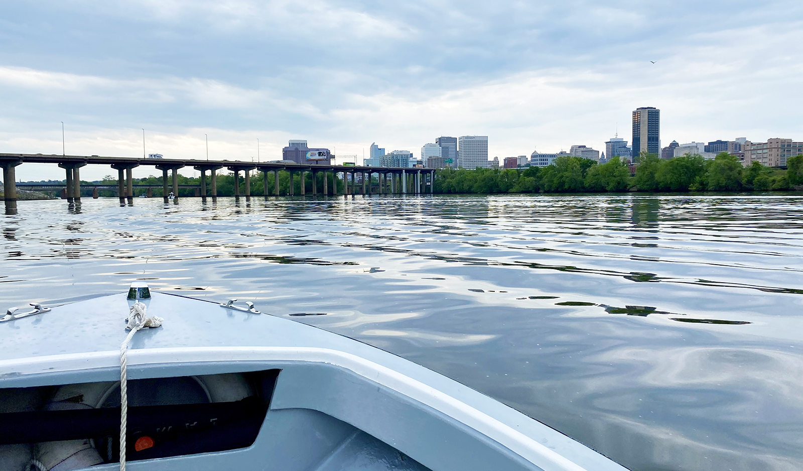 瑞德和我在 4 月中旬的一個溫和但多雲的春天大約中午在潮汐詹姆斯河上的洛基茨登陸(Rocketts Landing)相遇,距州際 I-95 和里士滿市中心不遠。我假設我們會在到達我們的第一個地方之前乘坐 Reid 的滑雪板乘船一下。嗯嗯。我們離開碼頭,立即開始釣魚。我可以看到里士滿的天際線,甚至不用眼睛。