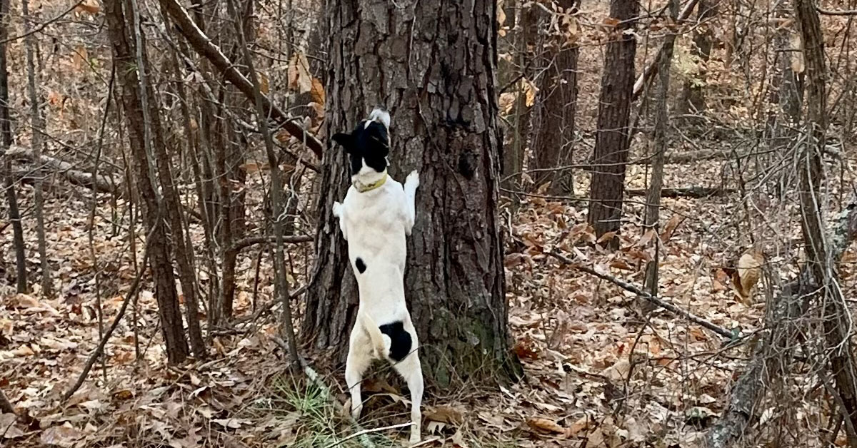 如果我們幸運,松鼠最終會在空中的幽默中凍結,尋求融入樹中。值得慶幸的是,Trapper 會繞著樹根旋轉,幫助我們看到灌木尾。