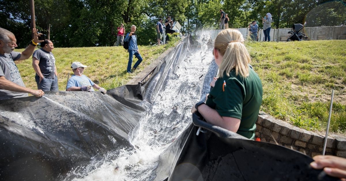 「每年都會帶來新的挑戰,」達勒姆說。「今年,我們使用舊的池塘襯材料將公園石樓梯轉化為 50 英尺魚滑梯,以便將魚從卡車帶到水中,並且對他們(和我們)的處理壓力盡可能最少。」