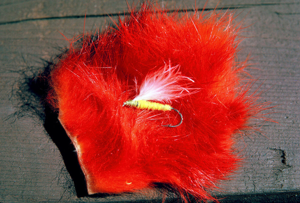錐形領頭的尾端是我設計的緊湊型斜紋機,其機身搭配堅固的紅色頭部和短的白色馬拉布翼。為了讓它下降到水柱喜歡躺的中間水柱水平,我在鉤柄周圍繞著少量鉛,然後再穿著飛鼠。我也使用了一條沉頭線。