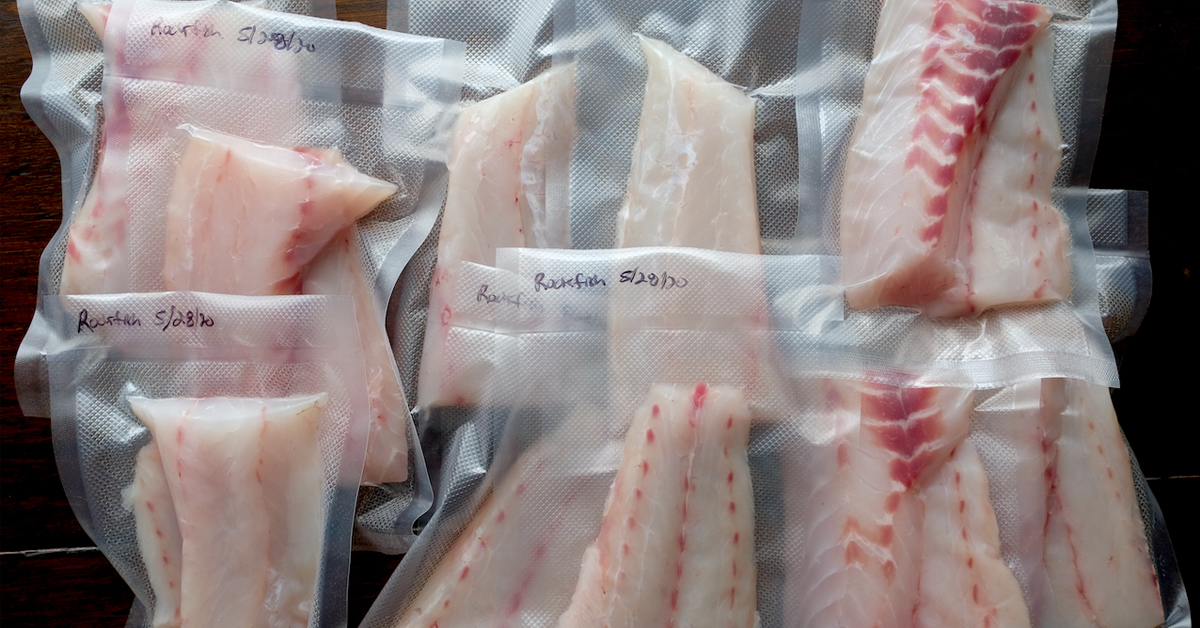骨頭:魚骨通常像針狀,喜歡在真空袋和密封塑料袋中打孔。防止這種情況的最佳方法是如果骨頭突出的話去除或修剪,然後用一層紙或塑料包裹它們,以保持它們與袋子的側面水平,或添加一層厚度以防止穿刺。如果我真空封條件的魚,而且板或背翅在袋子裡打了一個孔,我將袋子剪下以便可放進另一個袋子裡,然後再次密封。羊皮紙,蠟紙或泡棉板都很好用,以防止袋子被穿刺。