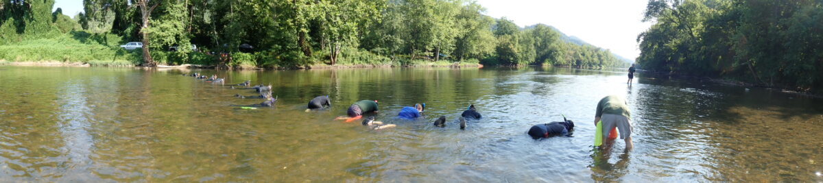 世界上沒有其他地方的水生物學家沒有機會在一個地方看到如此多稀有和危險的物種,就像這條坐落在弗吉尼亞西南部阿帕拉奇山脈的這條河裡。尋找貝類的愛好者會穿著潛水服和浮潛,然後將自己置身在河床上,在河底尋找貝類。如果他們發現一種,他們會向筆記者呼叫這種物種,他們手上手上的剪貼板保持垂直在河內的記事人。部分貝類的長度將進行測量,以幫助研究人員了解人口的年齡結構和健康狀況。