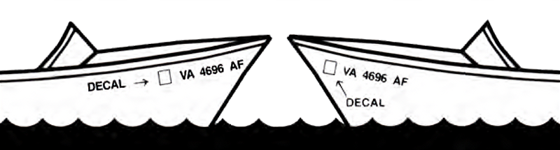 The number issued to your watercraft appears on the registration and is to be displayed exactly as it appears on each side of the forward half of the vessel in block letters, at least 3 inches in height, and contrasting in color with hull or background. They may be painted or attached to the watercraft, must read from left to right, and must always be legible. A space or hyphen must separate both the “VA” abbreviation and the letter suffix from the numerals.