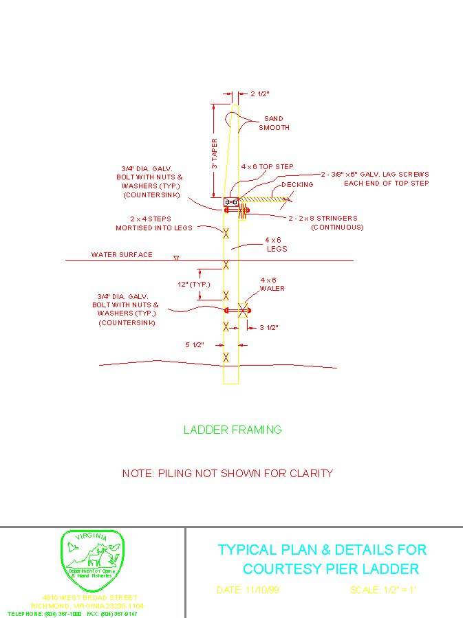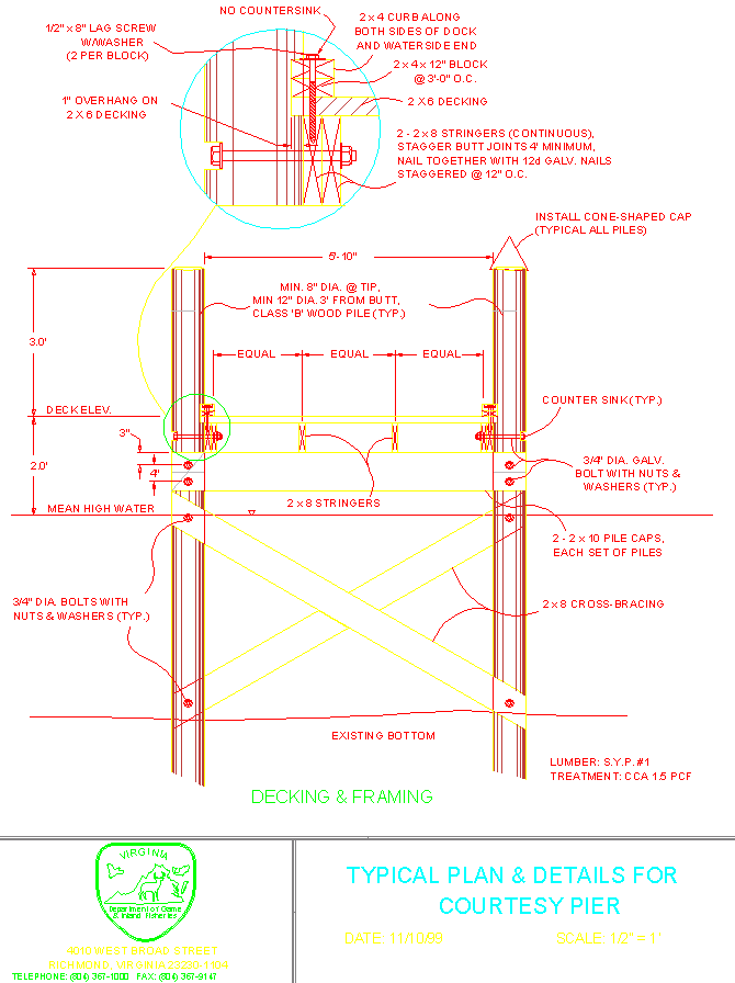 用於碼頭的木材應經過壓力處理以延緩腐蝕。歷史上,CCA(鉻化鎢酸銅)處理的木材一直是我們碼頭建造的首選處理方式。環境保護局(EPA)認為 CCA 處理的木材不適用於木材可能經常接觸皮膚的應用。CCA 處理的木材不應在淡水中使用。因此,我們使用 CCA 處理的木材,在木材與鹽水持續接觸,或處於持續濕潤的條件中,例如碼頭樁、交叉支撐、甲板繩和樑。對於所有可能與皮膚接觸的應用,我們選擇使用銅唑(CA)的替代處理,以便與鍍鋅塗層硬件兼容。與鹽水持續接觸的 CCA 木材應處理至 2 級別。每立方英尺(pcf)木材的保留量 5 磅。會受到鹽水飛濺的木材應該保留率為 1。5 個案例對於會經常接觸皮膚(例如甲板、扶手和梯子)的淡水和木材,加工處理的木材指定為「接觸地面或淡水」,最低保留率為 0。21 pcf 和優先保留 0。31 pcf 是首選的木材。所有螺栓和釘子都應為熱浸鍍鋅。如果硬件會經常與鹽水接觸,不銹鋼將更好的選擇,因為我們的經驗是,即使是鍍鋅五金也會及時生鏽。