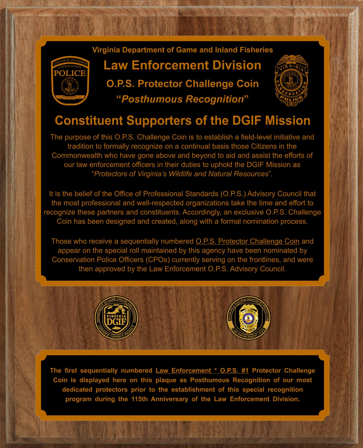 O.P.S. 挑戰硬幣的目的是建立領域層級的倡議和傳統,以持續地正式承認那些英聯邦公民,他們超越了地幫助和協助我們執法人員完成他們維持 DWR 使命作為「弗吉尼亞州野生動物和自然資源保護者」的任務。