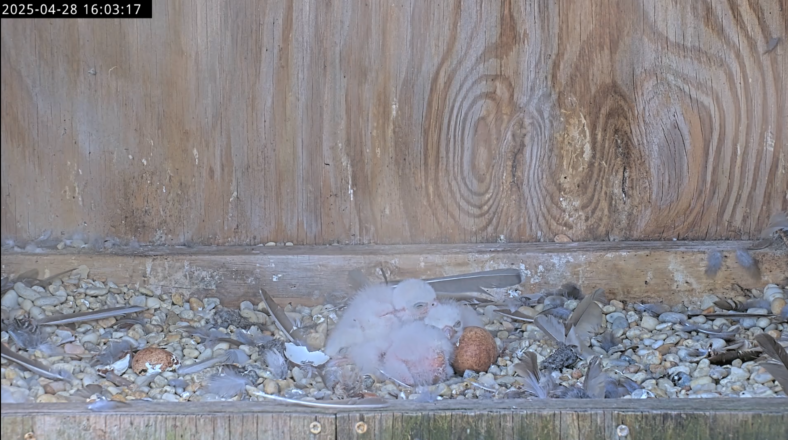 由於列治文新增了三隻新孵化的野鷹小雞,這個巢箱比一周前更活躍了!在這個時候,小雞的大小比起來幾乎增加了一倍,坐起來並保持穩定,並打開眼睛。但是,如此快速發展需要大量精力,因此觀眾仍應該期望看到他們大部分時間都會在睡覺和被其中一位成年人的沉醉。