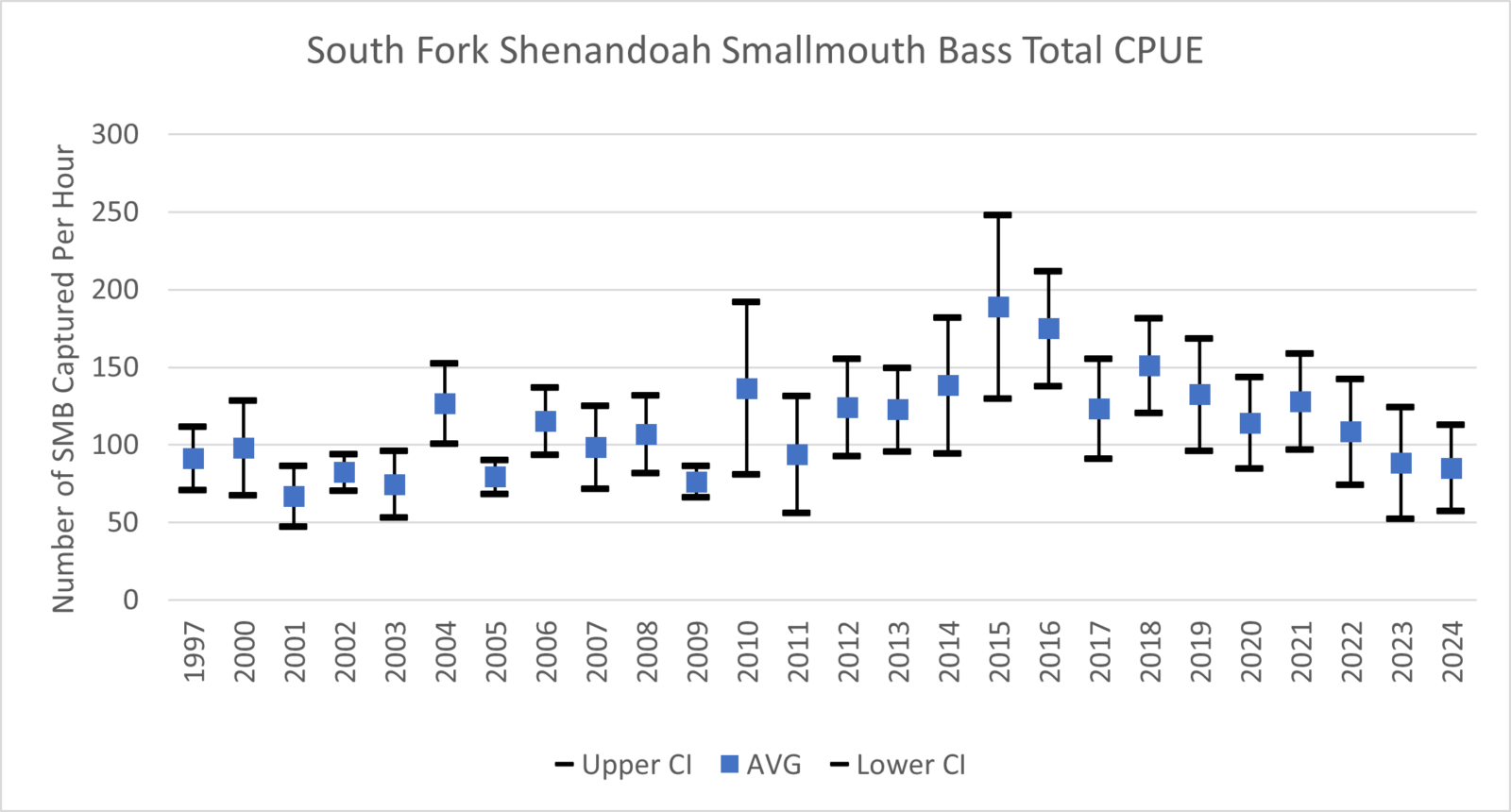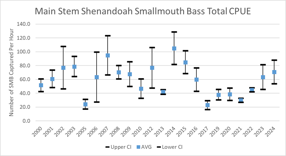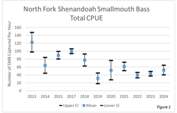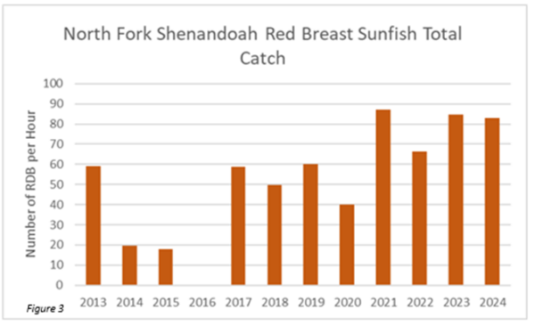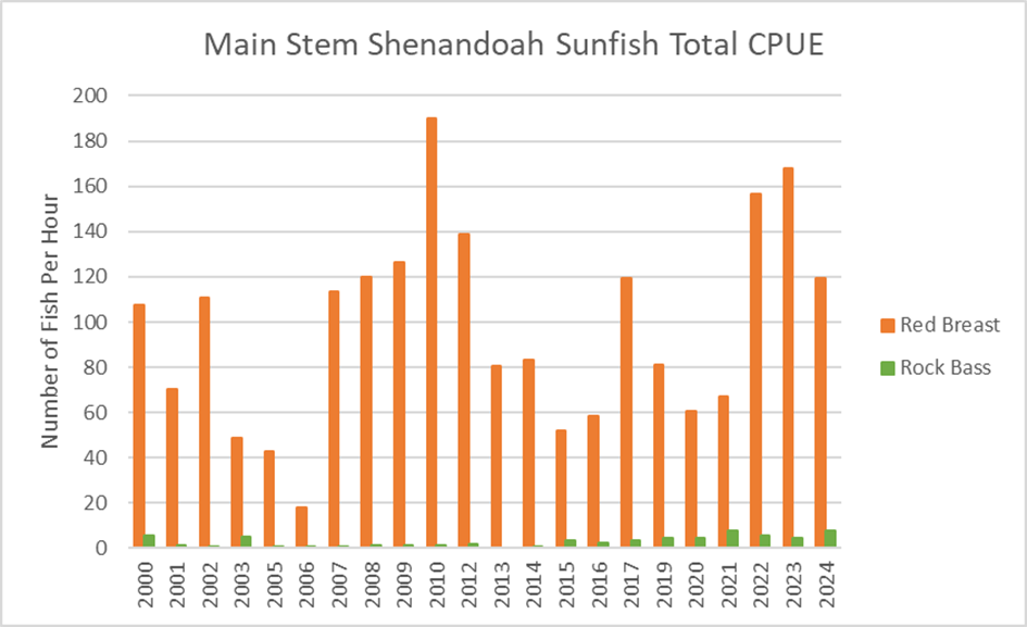 南堡雪南多亞河被釣魚者稱為「數字」漁業,這意味著釣魚者可以期待在任何一天捕捉合理量的鯊魚和太陽魚。在我們的 2024 秋季抽樣期間,我們從九個採樣地點採集了 710 小魚,以每小時 85 魚的速率(圖 1)。大約 26 百分比為 11 英寸或更大,6 百分比超過 14 英寸和 1 百分比為 17 英寸以上。我們的捕獲率與 2023 樣本幾乎相同,與長期平均值略有下降。儘管近期捕獲率下降,但人口看來很有利,質量的魚類數量不錯。總體而言,我們的樣本產生了高 8-11 英寸小口,這是因為 2021 的產生量高於平均水分的直接結果。這是 South Fork 非常典型的,捕獲率很棒,質量大小的魚數量較低。如果我們在 2025 中產生超過平均水平,我們目前的捕獲率將會有所提高。過去兩年,由於乾旱條件,我們的產卵成功非常低。當我們在春季產生期間水量極高,或夏季極度乾燥時,小嘴幼犬很難招募到人群中。希望未來一年我們有更有利的天氣,以幫助增加人口。