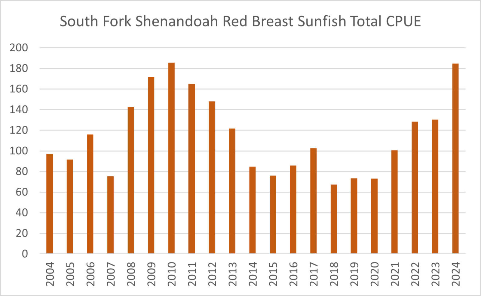 神南多亞的另一個成功故事是太陽魚群,特別是紅胸太陽魚。經過七年的人口從 2014 到 2020 的衰退後,人口已經很好地反彈(圖 2)。過去三年,我們觀察到捕獲率超過長期平均水平,其中 21 百分比為 > 6 英寸的長度。自從我們開始採樣 South Fork 以來,我們的捕獲量是第二高,因此釣魚人士應該不會遇到困難。