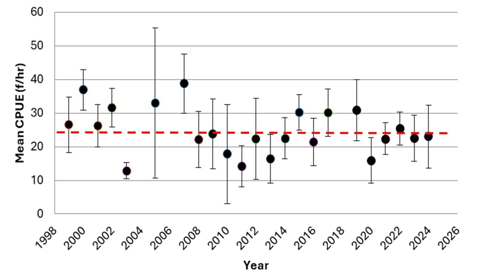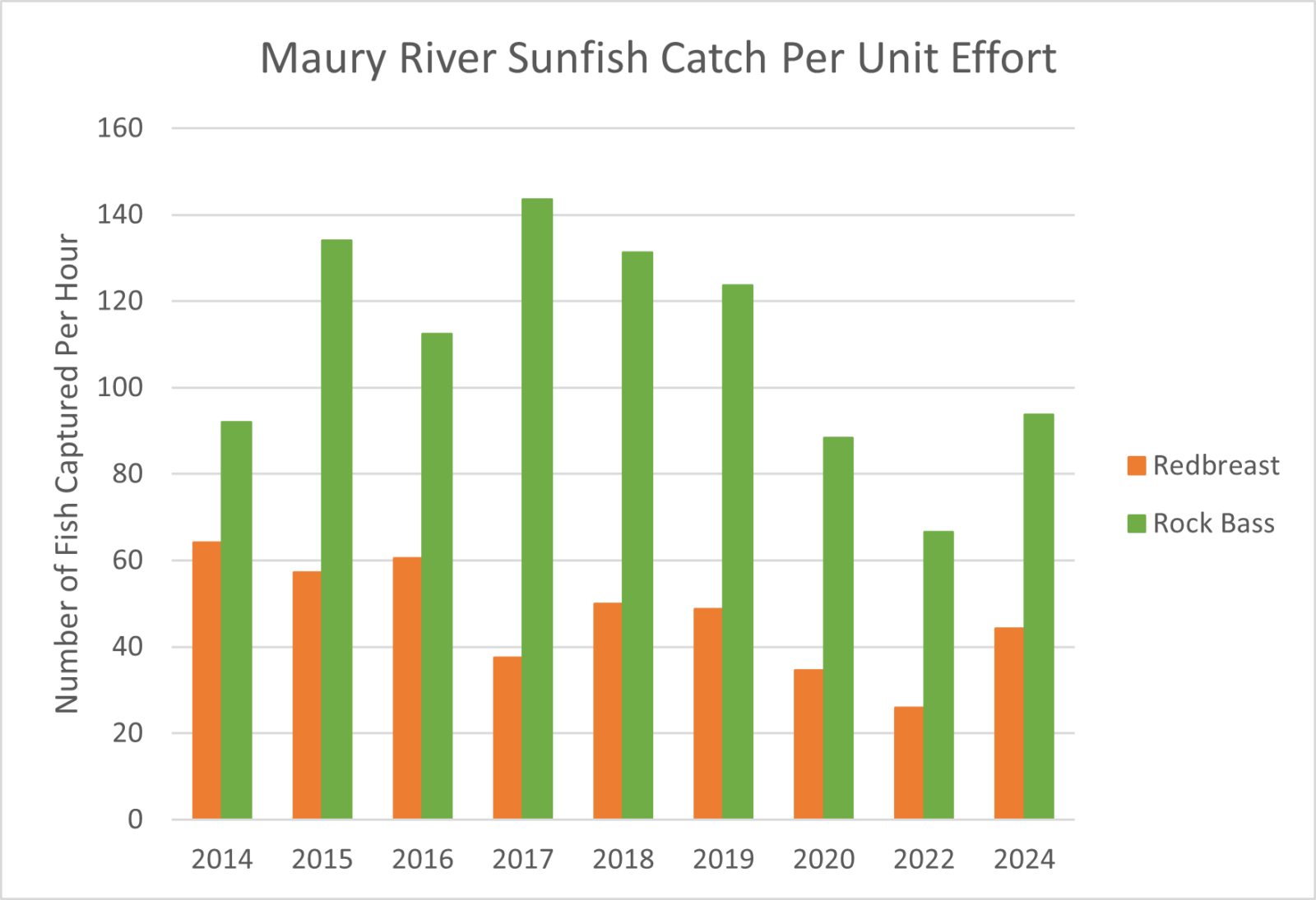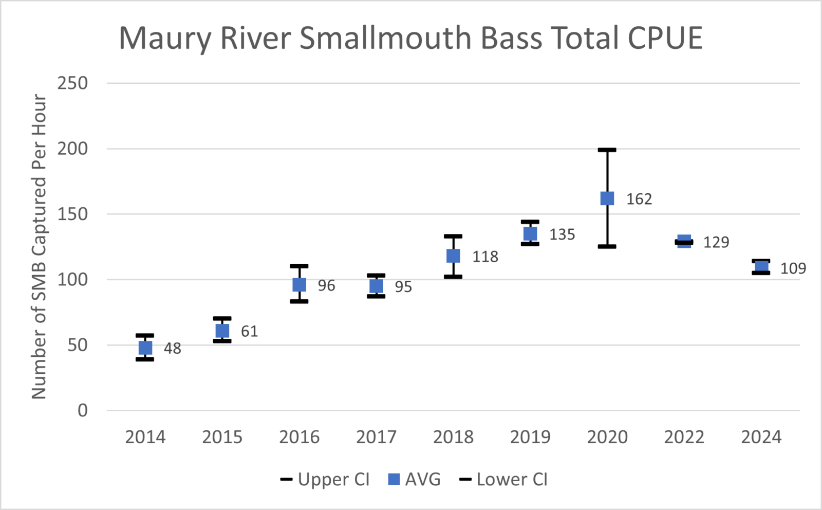 在小嘴巴生產方面,莫里河是該州最一致的河流之一。我們今年春天的捕獲率略有下降,但其中大部分都是由於水狀況非常低。當水清澈的時候,魚類傾向於避免捕獲,並前往我們無法接觸到的地方更深的水域。無論如何,我們的捕獲率都在長期平均水平範圍內(圖 1)。