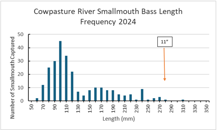 牛牧河是聯邦西部最美麗的河流之一。當水位溫和時,釣魚者可以期待捕捉各種各樣的魚類。在秋季期間,2024 生物學家採樣了四個收集 20 物種的地點。小嘴族群正在困境。與詹姆斯河相似,多年來,它的產卵不佳。因此,系統中存在很少優質魚(魚 > 11 英寸)(圖 1)。