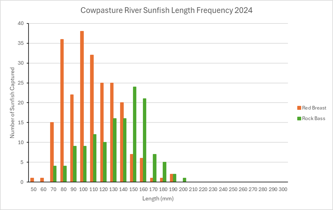 上方詹姆斯也是各種太陽魚的所在地,包括搖滾貝斯、紅胸和藍鳥。在 2024 中收集了超過 700 隻太陽魚,大多數魚的長度不等於 3 至 7 英寸。搖滾貝斯最豐富,其次是紅胸太陽魚。至於上方詹姆斯州的貓魚,河道和平頭的數量應該與以前幾年相似,某些地方有豐富,但在河流上並不一致豐富。