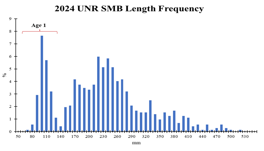 主幹正在回來!在我們的 2024 秋季抽樣期間,我們從三個地點收集了 230 小嘴巴,並觀察到了 71 的捕獲率。每小時 1 魚。河川捕獲率連續三年升趨勢(圖 1)。小嘴口的大約 37 百分比為 11 英寸,其中 20 百分比超過 14 英寸。5% 測量了 17 + 英寸。主幹的魚類健康問題不一致,像南堡一樣,並且產卵成功率較低。然而,2022 和 2023 的產生的長期平均值符合每小時 12 魚,這有助於提高我們的捕獲率。我們年度的 2024 年幼魚捕獲率低於長期平均水平,但系統仍然存在很多少年青少年捕獲率。這對漁業的未來將是良好的預兆。總體而言,我們觀察到尺寸類別的良好組合,儘管數量很低。釣魚者可以期待在排放前的魚,長度為 8-11 英寸的大量,因此在 2022 時會產生良好的好處。還有各種優質魚類,範圍從 14 到 18 + 英寸。優質魚數目仍高於長期平均每小時的 16 魚。