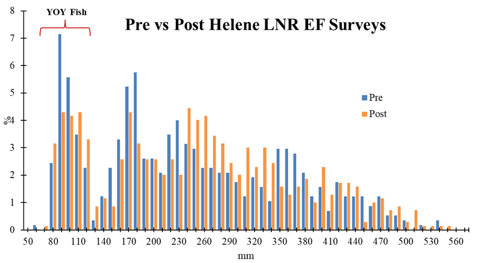 通過 2024 在新河下部的秋季電捕魚調查收集的魚長頻率圖。第一個峰值表明,在颱風海倫之前和之後,2024-年級的魚數量很高。