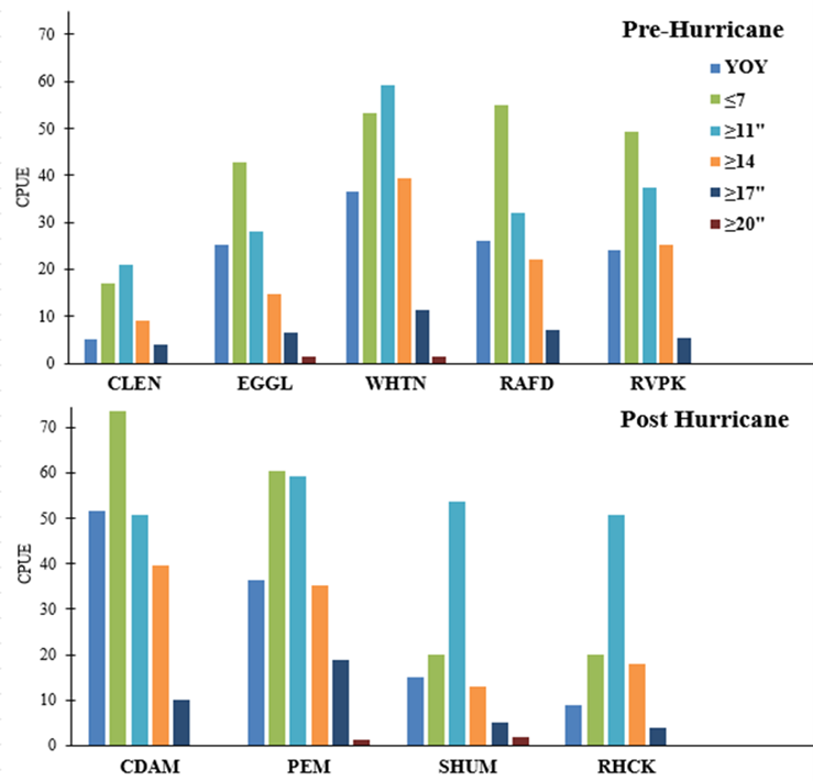 根據克萊托水壩下方的地點,降低 EF 小茅斯貝殼捕獲率。頂部圖表描述了颶風 Helene 前進行的調查,而下圖則描述了颶風後大約 1 個月完成的調查。