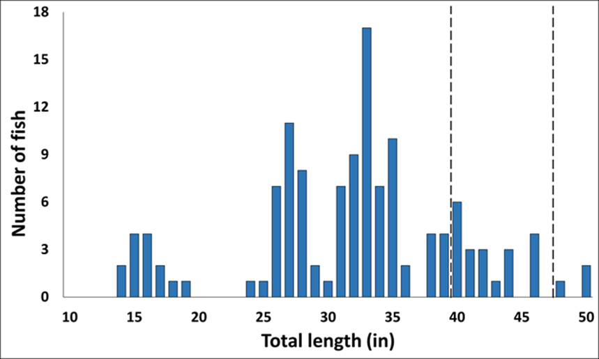 來自新河下部的馬斯基冬季電捕魚 LFQ 在 2024 中。虛線代表受保護位置限制 40-48」內的魚。