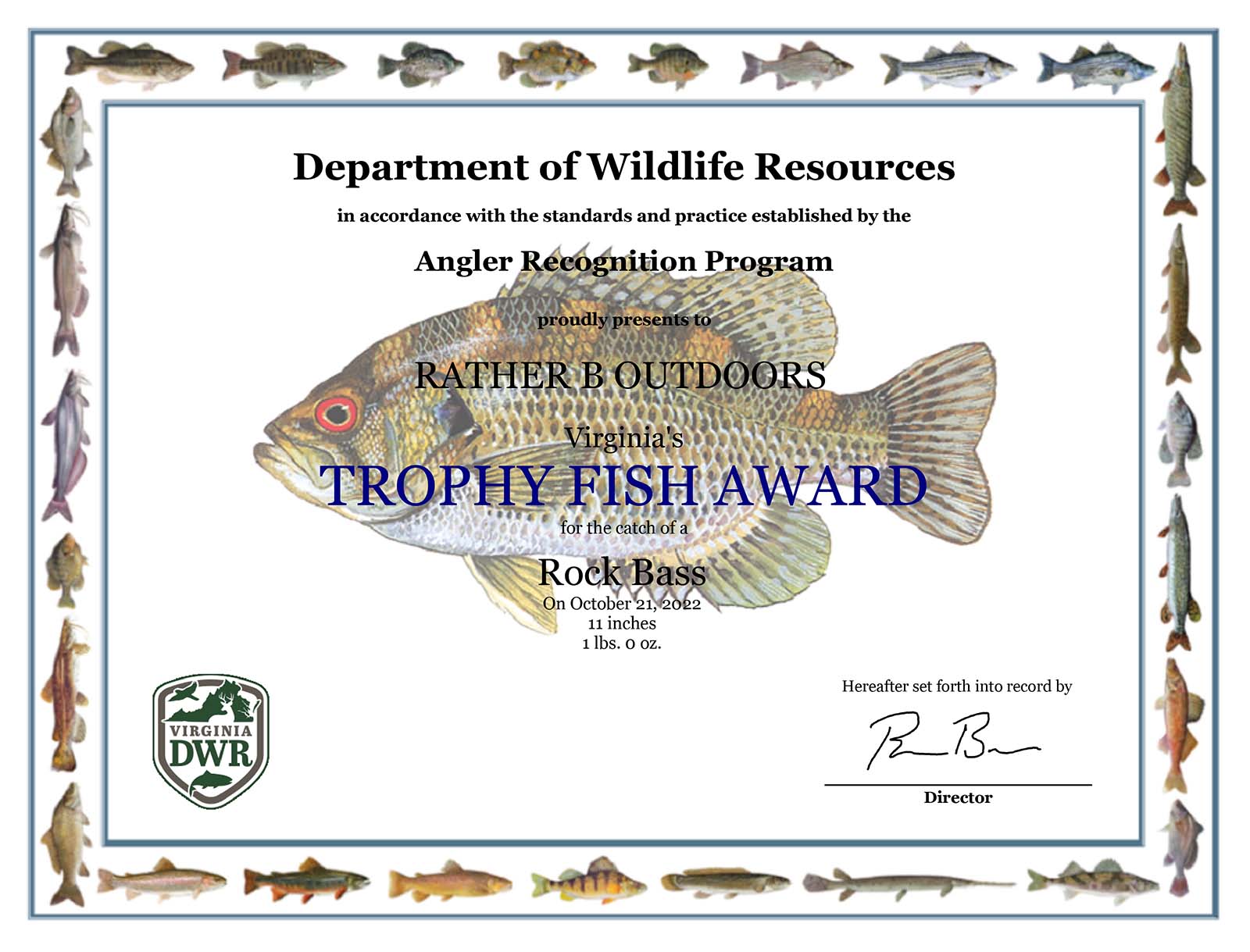 釣魚者對於在線弗吉尼亞釣魚者認可計劃註冊的獎盃大小魚獲得官方獎盃魚獎勵證書。證書展示著名野生動物藝術家 Duane Raver 的藝術品。每個證書都有釣魚者捕獲的魚種水印,並以釣魚者的姓名、捕獲日期以及魚的重量和/或長度進行個性化。證書以電子方式頒發的 PDF 格式,可以在家中查看或打印以與朋友和家人分享。這些證書非常適合您的社交媒體帳戶,分享您的漁獲並標記#VAWildlife,您便可以在 DWR 的社交媒體頁面上展示。