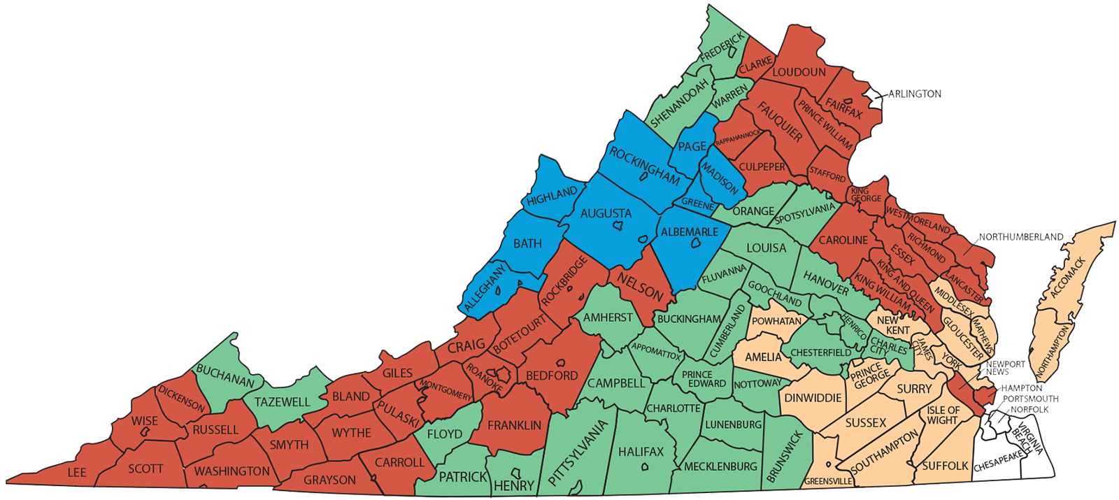 In the counties of Amherst, Appomattox, Brunswick, Buchanan, Buckingham, Campbell, Charles City, Charlotte, Chesterfield, Cumberland, Floyd, Fluvanna, Frederick, Goochland, Halifax, Hanover, Henrico, Henry, Louisa, Lunenburg, Mecklenburg, Nottoway, Orange, Patrick, Pittsylvania, Prince Edward, Shenandoah, Spotsylvania, Tazewell, and Warren.