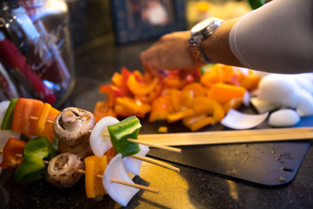 - 當棒浸泡時,切碎紅洋蔥和甜椒