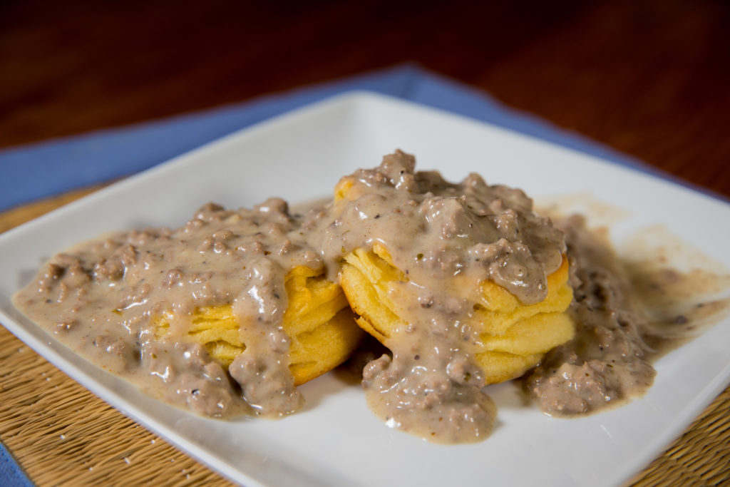 - 繼續加入牛奶和麵粉以獲得肉汁所需的濃度。不斷攪拌混合物。它不應該很薄,但應該有足夠的肉汁,可以輕鬆倒在餅乾上。