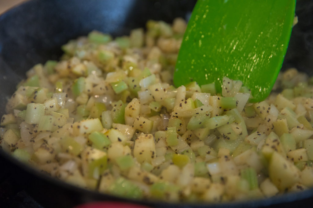 - 在帶黃油的煎鍋中,煮洋蔥,芹菜和蘋果直到軟化。完成後加入香腸中。