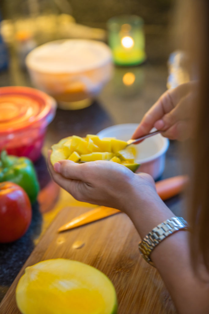 - 將芒果,洋蔥,辣椒和香菜切成小粒。