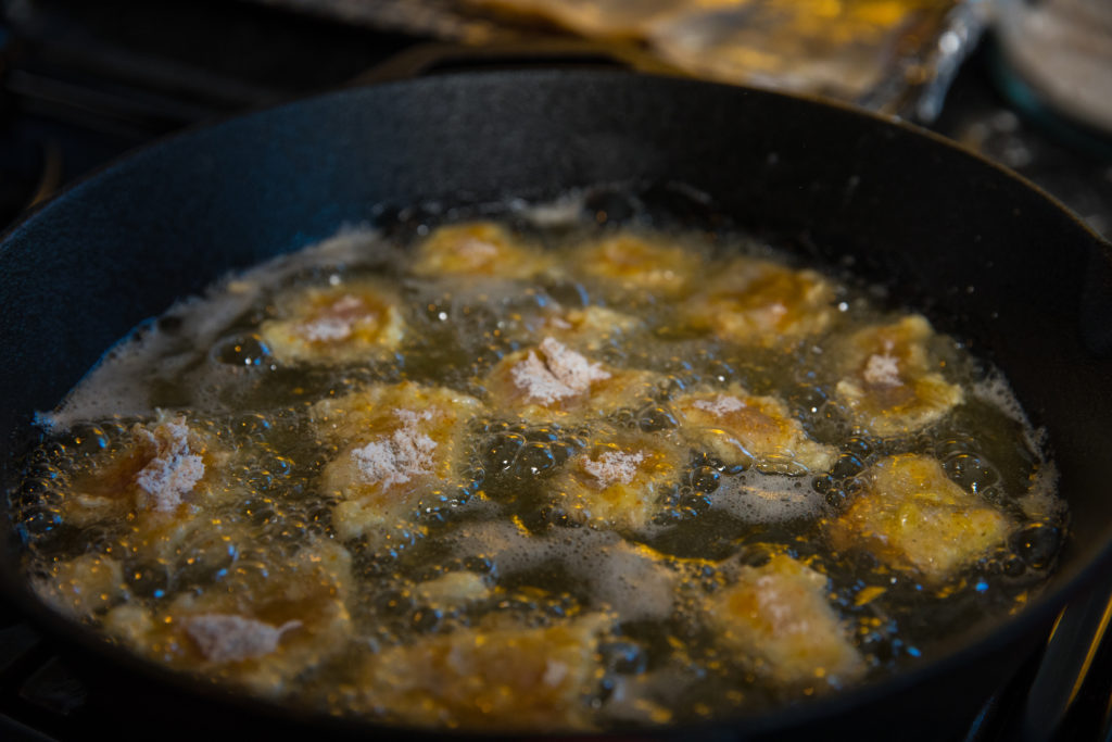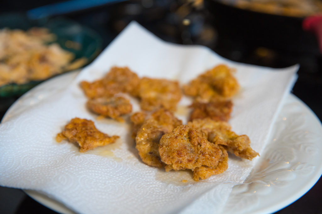 - 炸到您喜歡的濃度時,將炸鮭魚放在紙巾上以吸收額外的油脂。