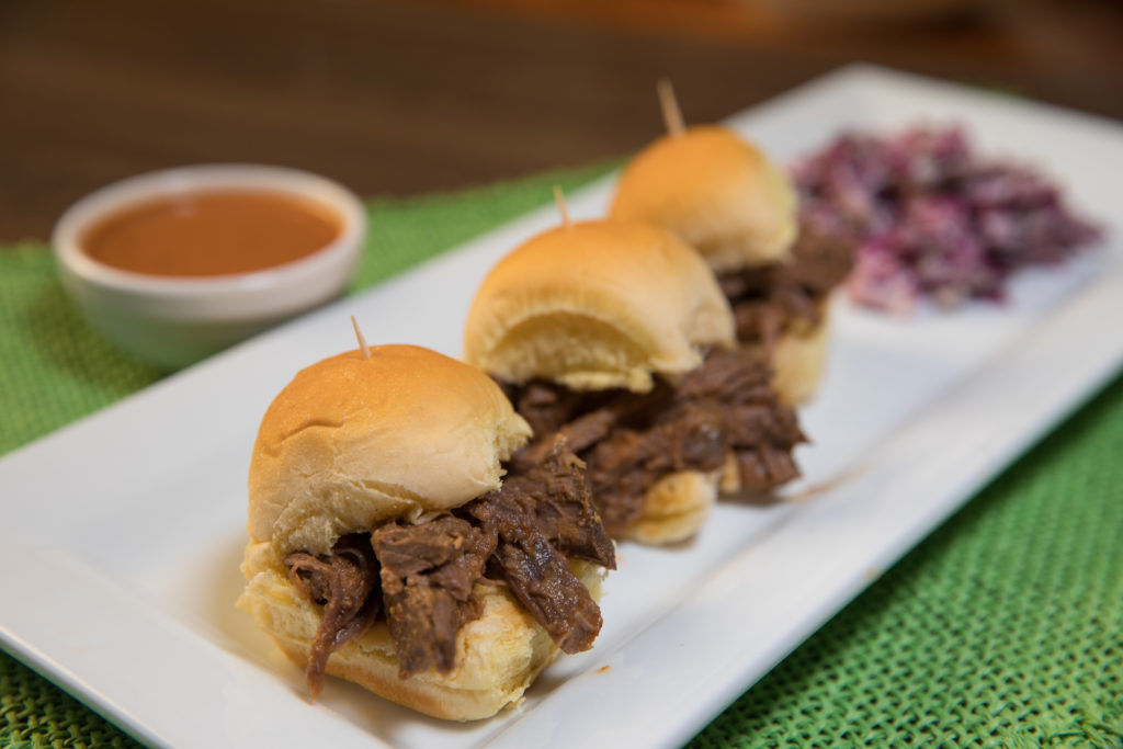 - 將烤肉拆開,直到所有肉切碎,然後加入燒烤醬。攪拌均勻至切碎的肉中。讓火煮幾個小時。
