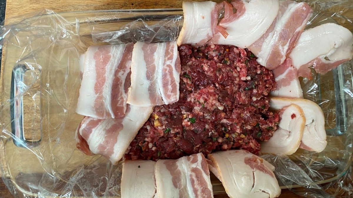 6 上折疊。將大約一英寸調味的肉類混合物壓入培根床