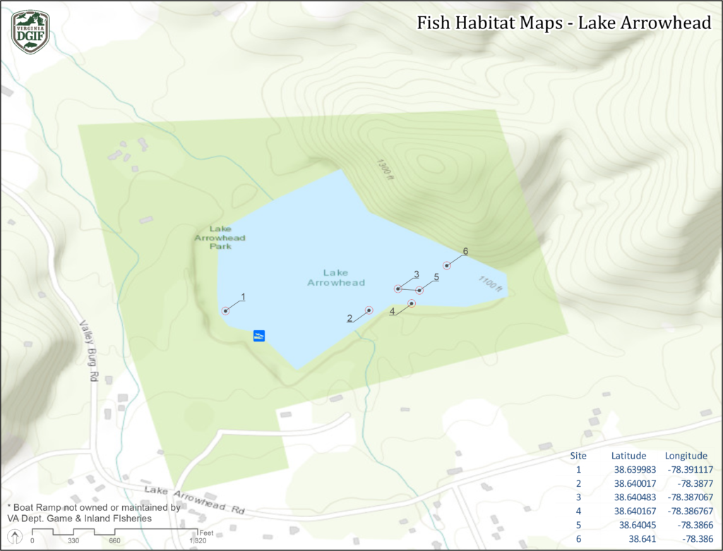 該部門的生物學家一直積極在湖中添加引魚器。近年來,過多的水生植物 (elodea) 已經成為湖泊淺水區的問題。Luray 鎮已經盡了很大的努力,使用除草劑和三倍体草魚來控制植被。釣魚者有機會在 Arrowhead 湖釣到大口鱸魚、北梭魚、藍鰓魚、螃蟹、紅鰭太陽魚和溝鲶。