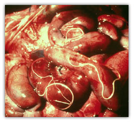 是的你發現的是鹿的一種非常常見的寄生蟲,叫做腹蟲。它的科學名稱是瀨田麗葉希。成年蠕蟲生活在腹腔中,生產在血液中循環的幼蟲。這些幼蟲被餵血的節節動物(例如蚊子)攝入,並發展到感染階段。然後,它們會在後面的血膳中通過矢量轉移到其他鹿。年齡不足或等於一歲的鹿最常被感染,顯然是由於老年動物的免疫力發展。蠕蟲造成鹿沒有問題,並且沒有人類健康影響