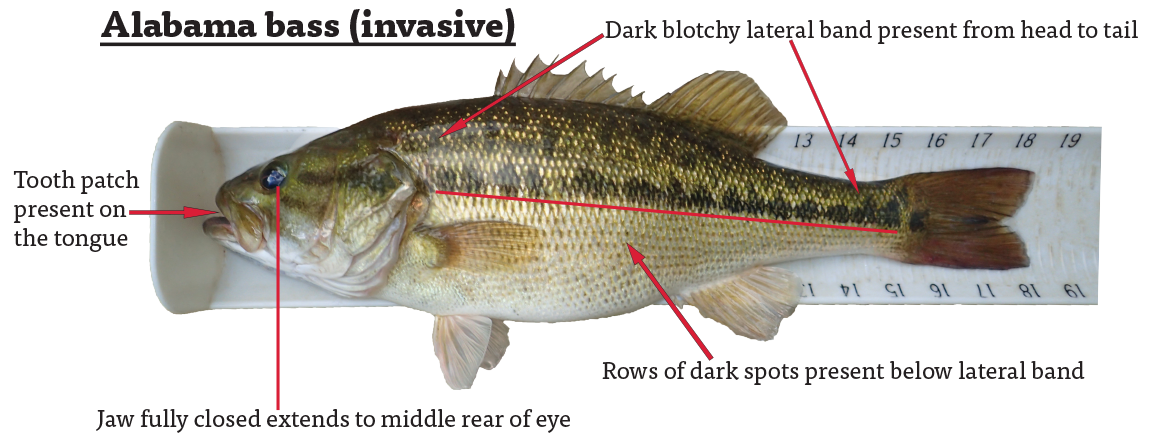 如果懷疑自己捕獲了阿拉巴馬貝斯的釣魚者,應該拍一張魚的照片,剪下一個骨盆翅的縮略圖大小部分,然後將翅片乾燥存放在信封中。骨盆翅位於魚的底部,就在頭下方。然後,他們可以透過fisheries@dwr.virginia.gov聯繫 DWR或在 804-367-1293