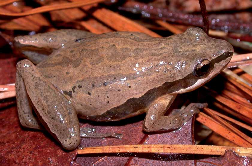 這種物種顏色可變,通常是棕色,有三條平行的深色背條紋大多或少明顯。從鼻子到腹股溝通過眼睛的黑色或深棕色側條。底面是黃色的,胸部通常有黑斑。眼睛之間沒有黑色三角形。