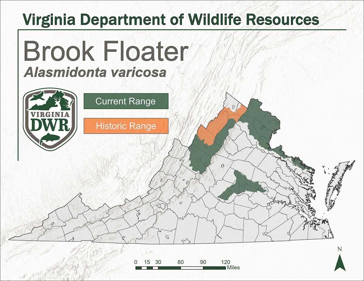 布魯克弗萊特(Brook Floater)是弗吉尼亞州大西洋斜坡原生的最稀有貝類之一。弗吉尼亞州漁業和水生動物中心(VFAWC)、弗吉尼亞理工學院的淡水軟體保護中心(FMCC)和弗吉尼亞理工學院的保育管理研究所(CMI)目前正在恢復這種物種的努力。截至 2024,已在波托馬克河流域的多個地點釋放了超過 4、000 孵化器種植的布魯克水龍。DWR 生物學家和合作夥伴定期訪問這些地點,以追蹤被釋放的貽貝的生長和存活情況,並指導未來的恢復工作。