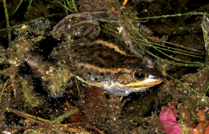 與其他真青蛙相比,這是一隻較小的青蛙。身體深棕色,背面有四條黃色或金棕色縱條紋。背側折疊沒有。腹部呈黃色,帶有深棕色或黑色斑點。