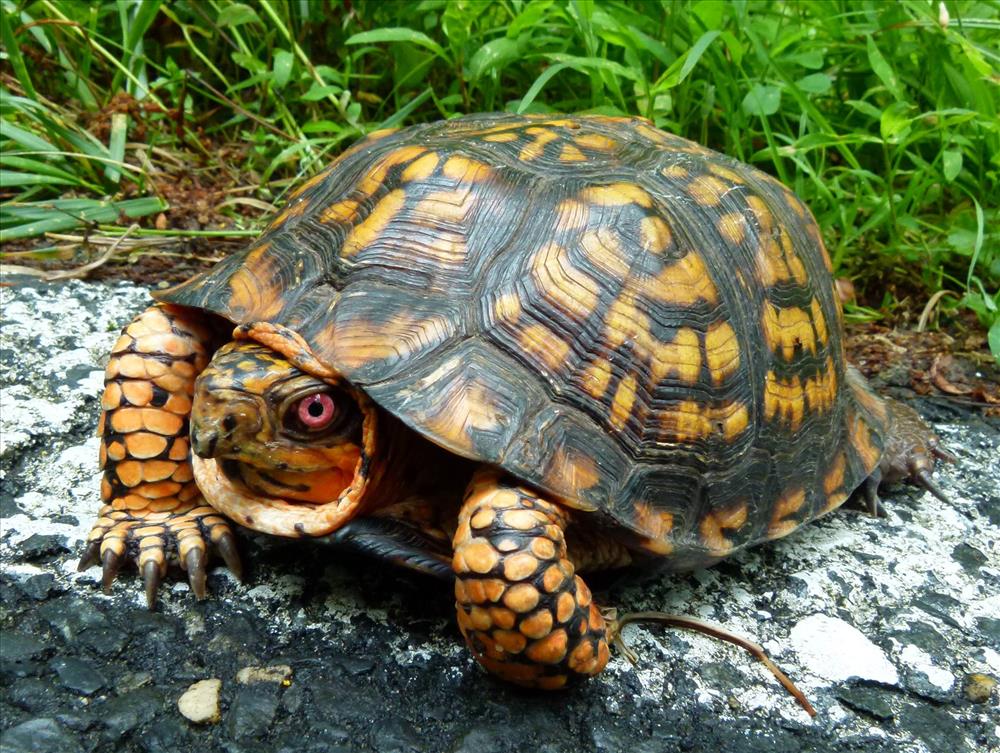 一隻公體箱龜的圖像;它們有紅眼和凹形塑形圖形(c)JD Kleopfer