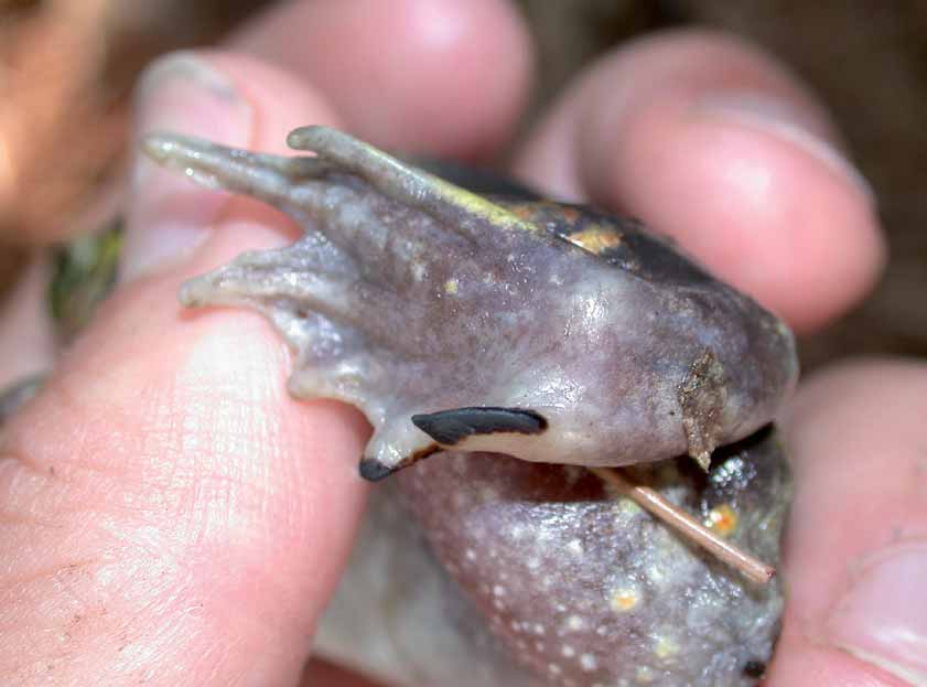 魚腳的名字來自每個後腳(右中)的黑色鏟子類似的附件(右中),用於挖掘在沙子或鬆散的土壤中。大型突出的眼睛具有垂直橢圓形的 pupil。通常是棕色,有時黃色或相當深色,通常有斑點,有兩條淺黃色的背部條紋從眼睛向下延伸到背部。它們還有小的脊椎腺和少量的粉刺。