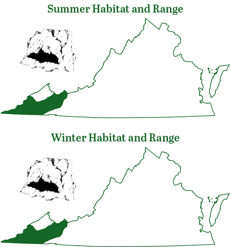 灰蝙蝠和弗吉尼亞大耳蝙蝠是弗吉尼亞州真正的洞穴蝙蝠,因為它們全年都使用洞穴進行休眠和夏季巢穴。雌性通常在洞穴中養育幼兒,通常有一條小溪流穿過它。雄性將建立單身殖民地,其中包括許多洞穴的家園。