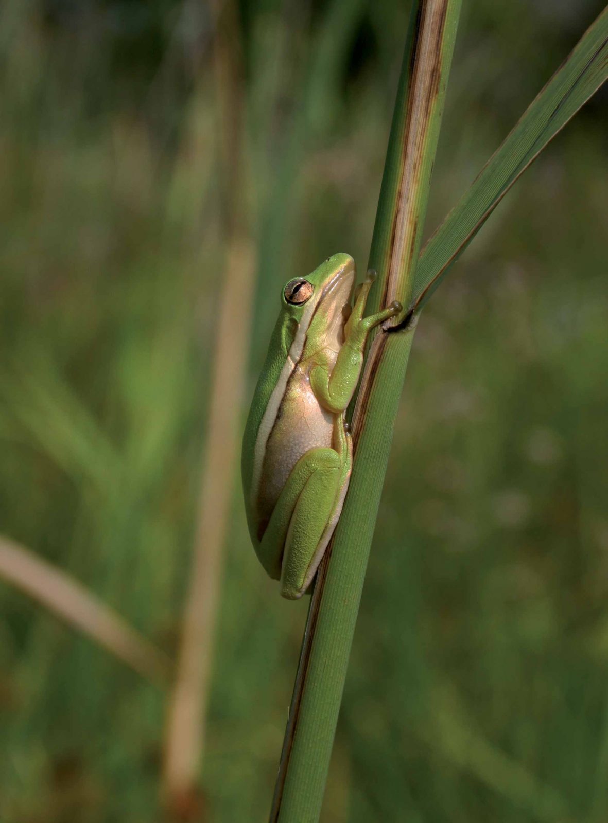 這隻小而纖細的青蛙通常是明亮的綠色,但可以是灰色或棕色的各種色調。通常,兩側都有一條明顯的白色至黃色條紋,從眼睛下方向延伸到腹股溝。但是,在某些人群中,這種條紋可能會減少或缺乏。許多個人背上有微小的金色斑點。腳趾墊很突出。