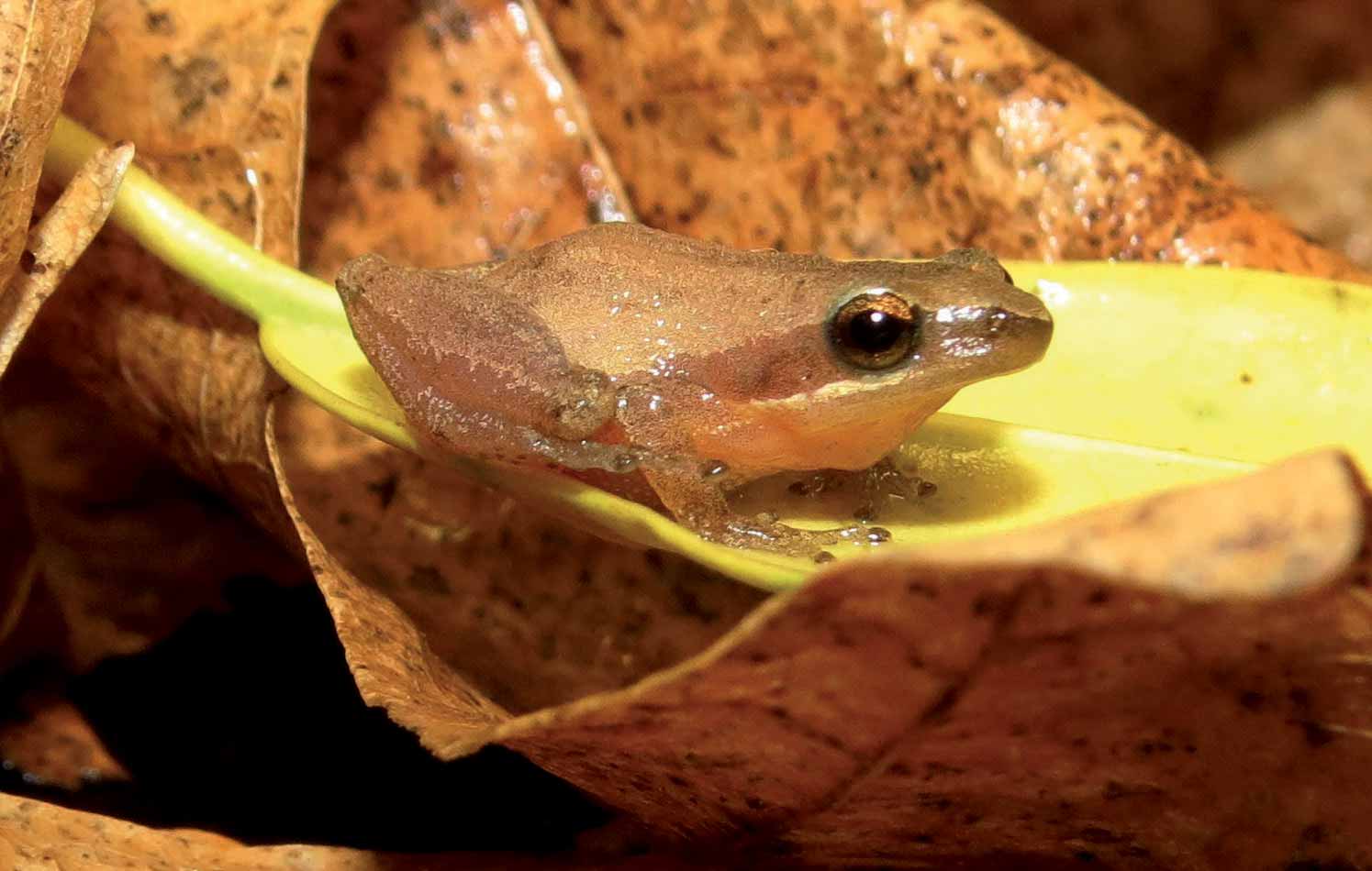 這種小青蛙的顏色可變,基本顏色為棕褐色,棕色,綠色,粉紅色到紅色。有一條黑色線穿過眼睛並進入身體側面。通常有一個狹窄的深色中背條,從眼睛之間為三角形開始,延伸到肛門區域。鼻子是尖的,通常沿下下巴有一條光線。腹部和胸部通常是白色或黃色的。